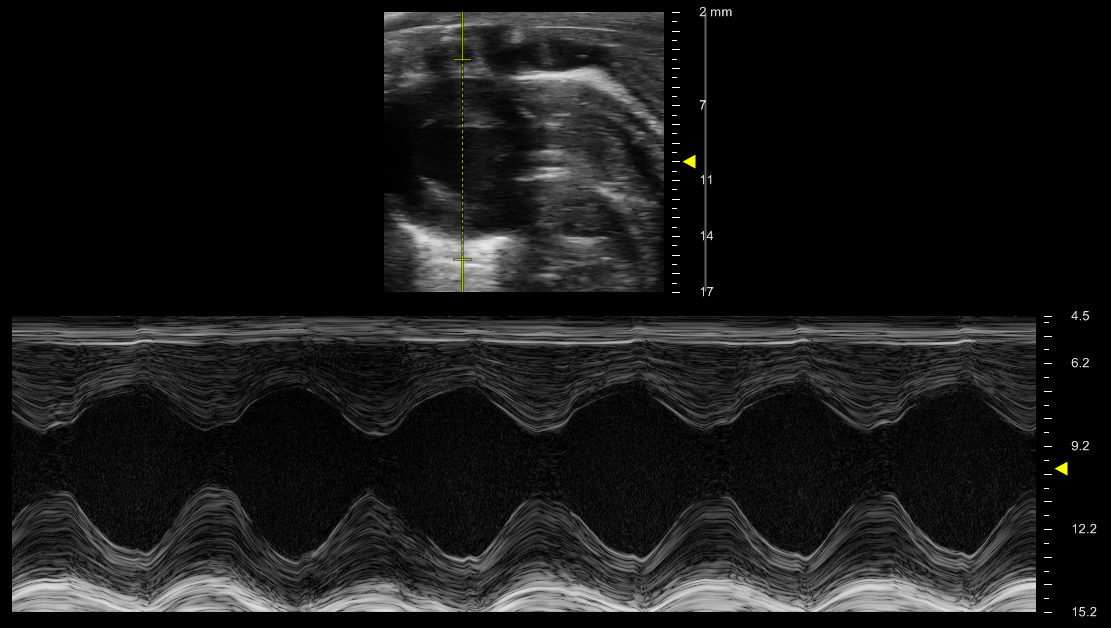 M-mode examines a line of Motion over time. Using M-mode in echocardiography displays the movement of the myocardium allowing for accurate and real-time measurements of wall thickness, internal diameter, and heart rate. It is from these parameters that many systolic parameters are derived (i.e. fractional shortening, ejection fraction, chamber volumes, etc.).